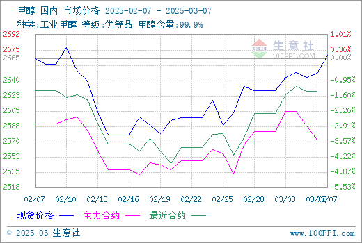 据生意社商品行情分析系统,3月3日至7日(截止10:00),国内甲醇市场华东港口均价自2644元/吨上涨至2669元/吨,周期内价格涨幅0.95%,环比上涨0.13%,同比下跌1.57%。国内甲醇市场偏强震荡。甲醇市场受下游烯烃询价外采、部分装置停车提振,行情走强运行为主。