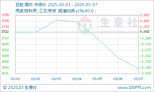 据生意社商品分析系统显示:3月开始,利空主导,豆粕行情上涨过后迎来跳水行情,价格稳步下行。3月1日,豆粕市场均价3722元/吨,3月7日,豆粕市场均价3642元/吨,价格下跌2.15%。