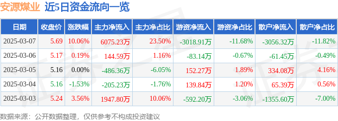 证券之星消息,安源煤业3月7日涨停收盘,收盘价5.69元。该股于9点52分涨停,未打开涨停,截止收盘封单资金为6112.47万元,占其流通市值1.09%。