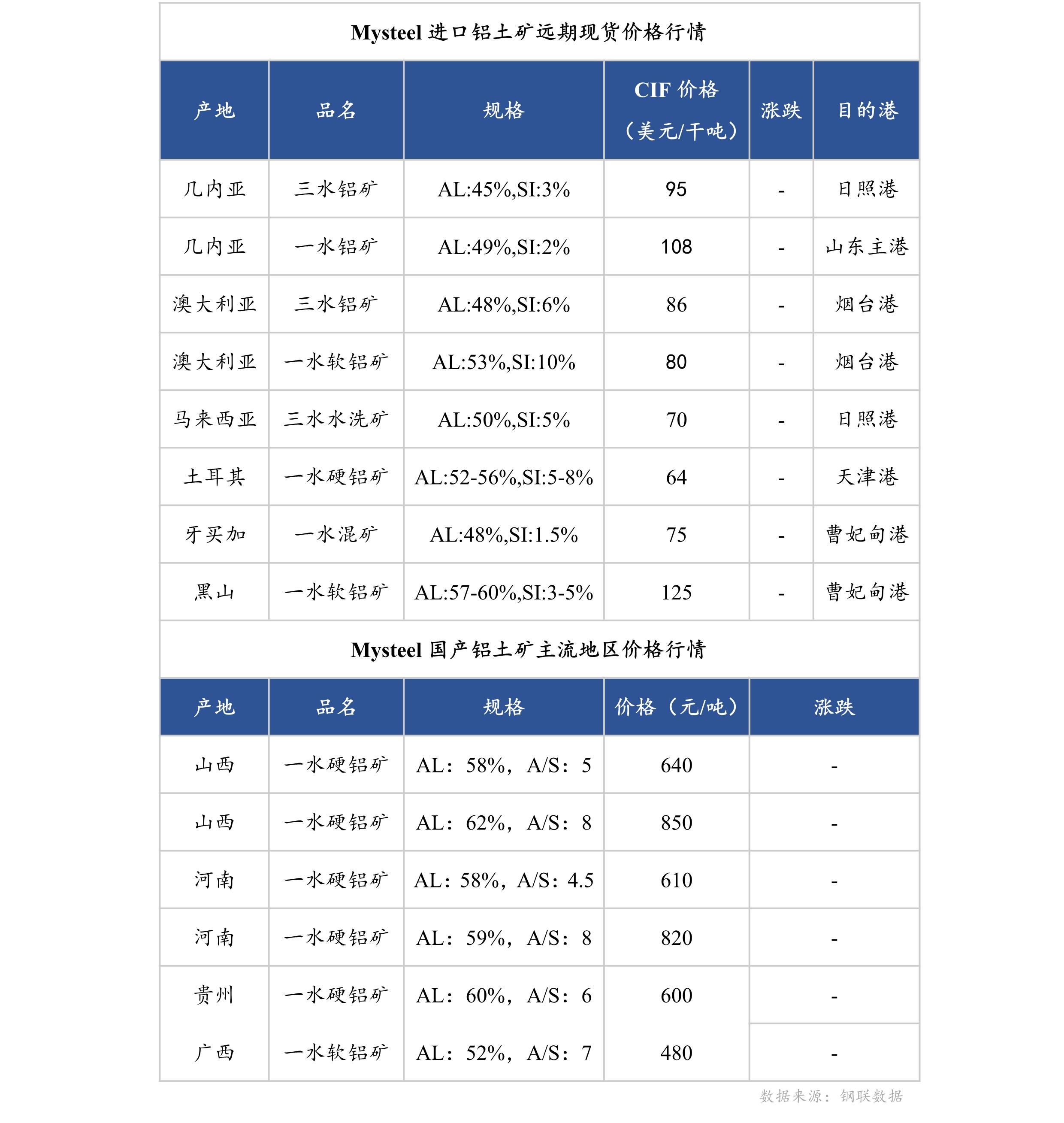 3月7日铝土矿价格僵持运行。据Mysteel调研,三门峡地区手续齐全的矿山正在逐步复采。经过长期停采,目前正处于整顿阶段,出矿还需一段时间。主流进口矿价格平稳运行。近期氧化铝价格稳中偏弱,对采购铝土矿仍持谨慎观望态度,市场活跃度低。