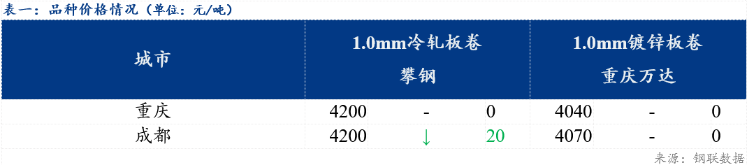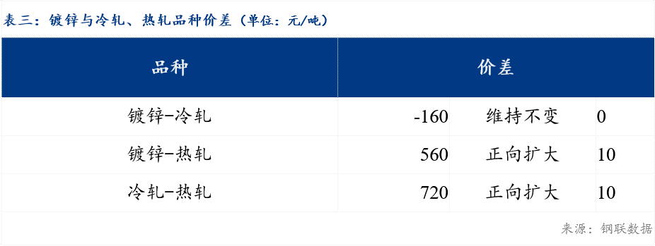 重庆、上海地区冷轧板卷区域价差维持不变,重庆、广州冷轧板卷区域价差维持不变;重庆、上海镀锌板卷区域价差维持不变,重庆、广州镀锌板卷区域价差缩小20元/吨。镀锌、冷轧品种价差维持不变;镀锌、热轧品种价差扩大10元/吨;冷轧、热轧品种价差扩大10元/吨。