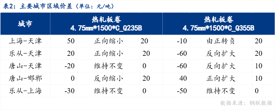 从区域价差来看,4.75mm普卷华南与华北价差20元/吨,华东与华北价差50元/吨,华南与华东价差-20元/吨。京津冀地区价差来看,唐山与天津价差0元/吨,唐山与邯郸价差-30元/吨 。