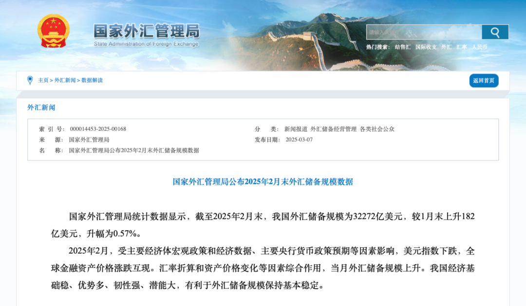 数据显示,截至2025年2月末,我国外汇储备规模为32272亿美元,较1月末增加182亿美元,增幅为0.57%。