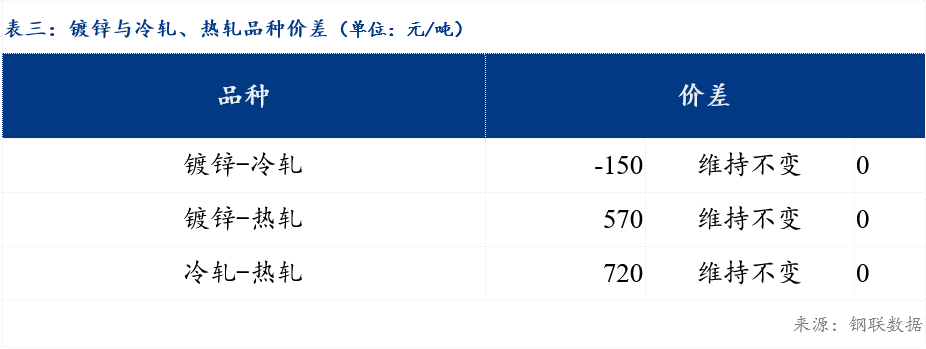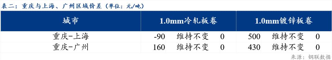重庆、上海地区冷轧板卷区域价差维持不变,重庆、广州冷轧板卷区域价差维持不变;重庆、上海镀锌板卷区域价差维持不变,重庆、广州镀锌板卷区域价差维持不变。镀锌、冷轧品种价差维持不变;镀锌、热轧品种价差维持不变;冷轧、热轧品种价差维持不变。