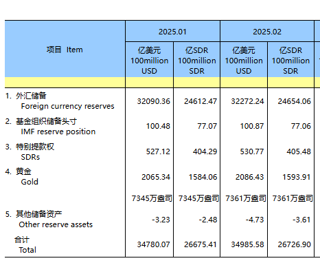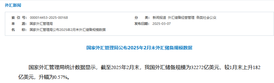数据显示,截至2025年2月末,我国外汇储备规模为32272亿美元,较1月末上升182亿美元,升幅为0.57%。