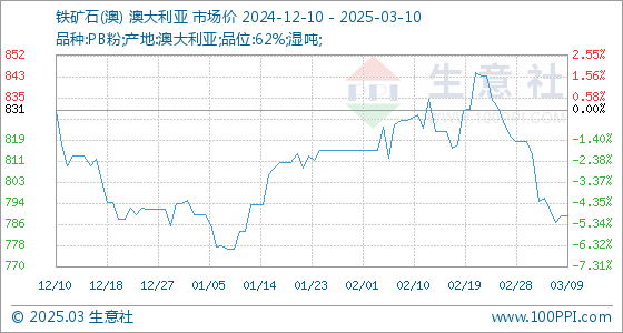3月10日生意社铁矿石(澳)基准价为790.00元/吨