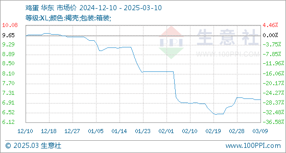 3月10日,生意社鸡蛋基准价为7.05元/公斤,与本月初(7.13元/公斤)相比,下降了-1.12%。