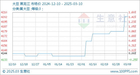 3月10日,生意社大豆基准价为4204.00元/吨,与本月初(4180.00元/吨)相比,上涨了0.57%。