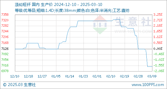 3月10日,生意社涤纶短纤基准价为7010.00元/吨,与本月初(7126.67元/吨)相比,下降了-1.64%。