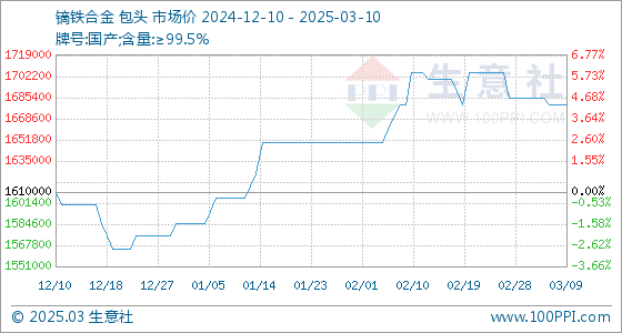 3月10日,生意社镝铁合金基准价为1680000.00元/吨,与本月初(1685000.00元/吨)相比,下降了-0.30%。