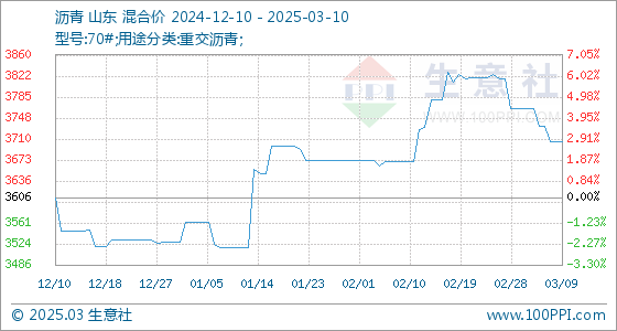 3月10日,生意社沥青基准价为3705.20元/吨,与本月初(3765.20元/吨)相比,下降了-1.59%。