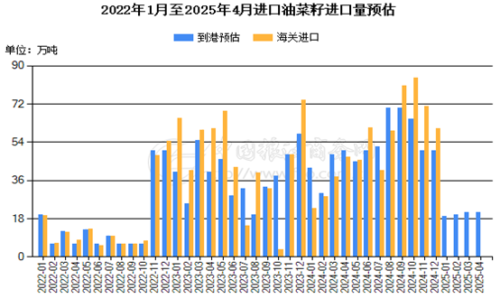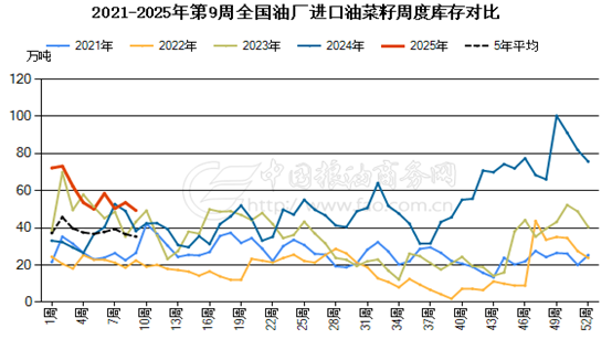另外,加拿大也是我国菜籽的主要进口来源国。据海关数据显示,2024年我国全年进口菜籽638.55万吨,同比增长16.28%。其中从加拿大进口了613万吨,占比为96%。在2024年9月商务部的反倾销调查开始后,加拿大菜籽到港前置,使得2024年菜籽进口量明显提升。然而,对于加菜籽的反倾销调查仍在进行当中,截止目前仍没有最终结果披露,我国从加拿大进口菜籽的规模已然开始收缩。据中国粮油商务网数据显示,2025年1-4月,菜籽月度进口量预估约20万吨,不到去年四季度月度进口量的1/3,也处于同期偏低水平。当前进口菜籽压榨油厂的菜籽库存也在不断下降,截止到2025年第9周末,国内进口油菜籽库存总量为49.4万吨,较上周的53.6万吨减少4.2万吨,去年同期为38.3万吨,五周平均为52.4万吨。整体供应压力正在逐步降低,菜油粕产出压力也将下滑。