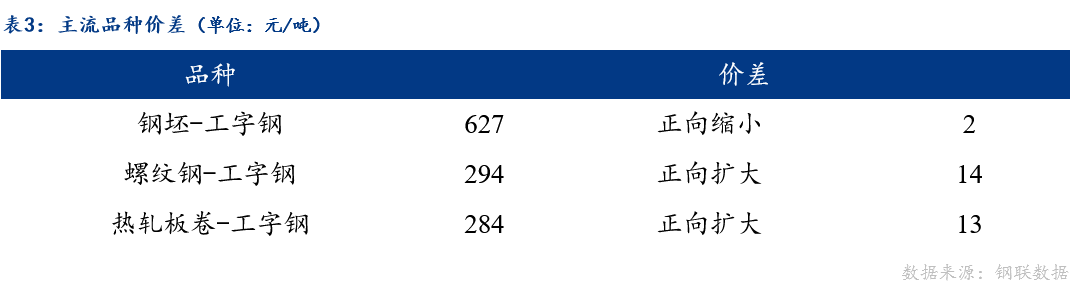 从品种价差来看,今日工字钢与钢坯的价差正向缩小,与螺纹钢和热轧板卷的价差正向扩大。