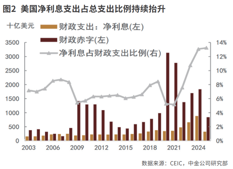 中金公司认为,伴随着美国债务规模的持续抬升以及不断增长的利息支出,美国财政正面临“财政扩张——利息支出增加、挤占正常财政支出——被动财政扩张腾挪空间”的恶性循环,财政效率下降会挤出财政对经济的正面带动,甚至可能拖累经济表现,财政整顿迫在眉睫。