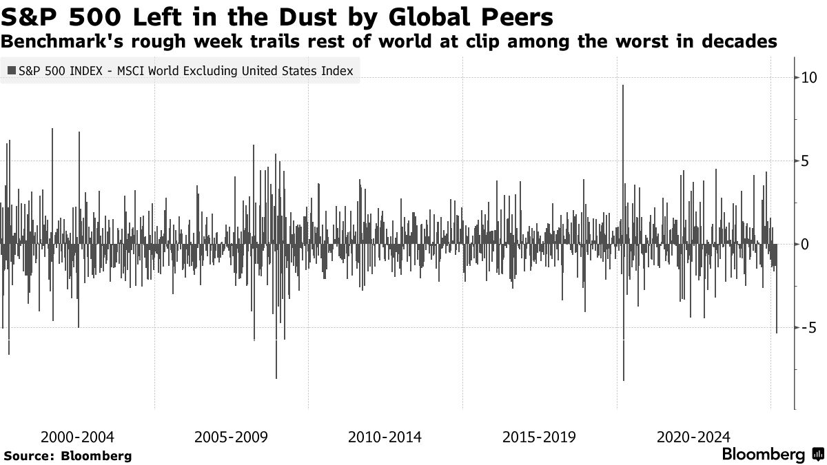 综合起来看,美国经济和市场例外论占据主导地位十多年的光环似乎正摇摇欲坠。一度势不可挡的标普500指数在距离刷新历史新高不到一个月的时间里,在上一周经历了本世纪以来相对于全球其他股市表现最差的一周。美股在全球股市市值中所占的份额也自今年年初超过50%的峰值有所下滑。
