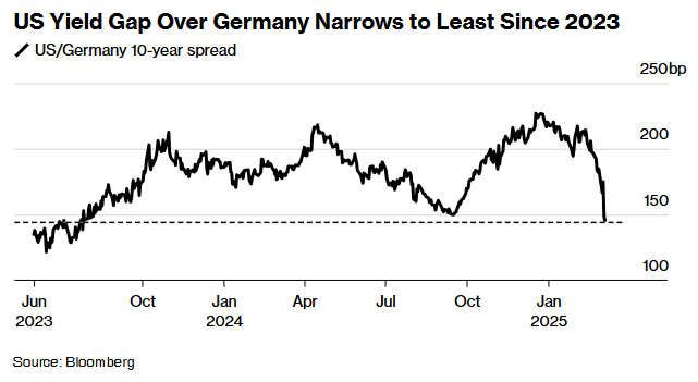 此外,由于投资者押注美国经济前景走软将需要美联储降息以提供更多支持,美债收益率大幅下挫。而由于投资者预计德国政府松开“债务刹车”将导致政府借贷大举增加,德国政府债券收益率大幅上涨。这导致美国对德国的长期债券收益率溢价突然缩小,至2023年以来的最低水平,并可能削弱美国国债的相对吸引力。