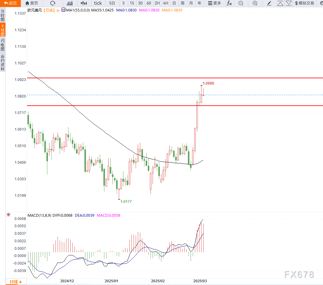 全球经济复苏,欧洲增长前景改善:据市场调查显示,德国政府的财政政策发生重大转向,可能推动欧洲经济复苏。随着欧元区经济前景改善,资金可能重新流向欧洲市场,支撑欧元走强,并削弱美元的相对优势。