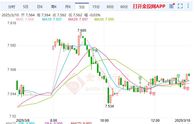 今日周一(3月10日)亚盘时段,纸白银目前交投于7.605一线下方,今日开盘于7.605,截至发稿,纸白银暂报7.558,上涨0.20%,最高触及7.605,最低下探7.543,目前来看,纸白银盘内短线偏向震荡走势。
