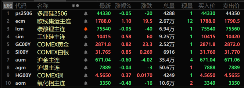 此外,氧化铝跌0.48%。碳酸锂微跌,工业硅涨0.58%。多晶硅主力期货微跌。