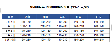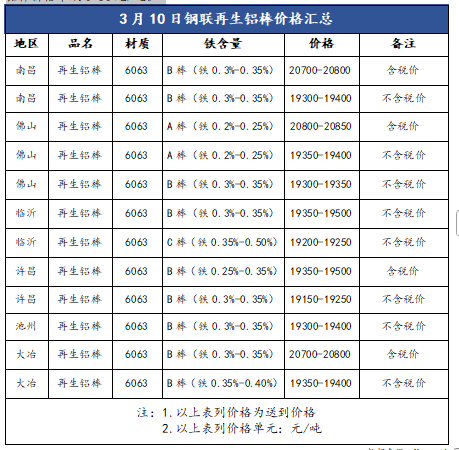 3月10日A00铝锭现货价华东20770,跌70;华南20740,跌30;中原20640,跌70(单位:元/吨)。铝价相对高位,再生棒厂积极出货接单为主,今日再生铝棒价格下跌0-50元/吨。