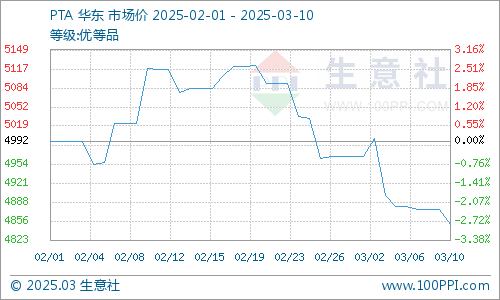 成本走弱,需求不足,3月以来国内PTA市场行情维持震荡下行态势。据生意社商品行情分析系统,截止3月10日华东地区PTA市场均价在4850元/吨,较月初下跌2.34%,同比下跌16.92%。