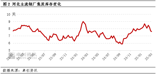 春节后国内高炉陆续复产,进入3月份复产高炉明显增加,铁水产量小幅增量,焦炭需求有所释放。截至3月7日,全国钢铁企业高炉开工率81.28%,较上月略增加0.34个百分点。高炉开工回升,焦炭消耗增加,且钢厂对焦炭价格看空,持续控制到货节奏,钢厂焦炭库存水平维持小幅下滑。截至3月6日,河北主流钢厂焦炭库存可用天数7.6天,较上周略降0.1天,较上月高点降0.9天,降幅10.59%。