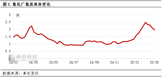 焦炭价格连续十轮下滑后,国内焦化企业亏损面扩大,叠加需求偏弱,出货压力大,部分焦企开工意向下滑,国内焦企开工负荷维持小幅下行。3月初重要会议期间,华北地区环保压力明显增加,河北、山东局部区域焦化企业生产受限,唐山地区焦企限产30%-40%,截至3月6日卓创资讯跟踪的全国104家独立焦化企业周度开工率72.5%,环比上周降1.9个百分点,较上月降2.6个百分点。焦企开工下滑,供应收缩,库存压力也随之减小,另外3月份部分贸易商入场,投机需求略有增加,焦企整体出货较上月好转,库存逐渐消化。截至3月7日卓创资讯跟踪统计的63家独立焦化企业焦炭库存可用天数1.96天,较上周降0.13天,较上月同期减少0.52天,降幅20.97%。