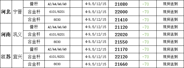 3月10日宁晋市场普铝杆现货报盘价21080元/吨,较上一交易日报价跌70元/吨;巩义市场普铝杆现货报盘价21120元/吨,较上一交易日报价跌70元/吨;宜兴市场普铝杆报盘价21170元/吨,较上一交易日报价跌70元/吨。