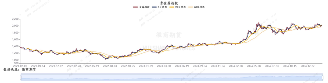 贵金属指数上涨1.92%。美国关税威胁、地缘政治局势引发市场担忧,避险情绪主导下,贵金属高位震荡。由于特朗普关税政策不确定性较高、地缘冲突等或仍将持续,大国博弈的底层逻辑未有实质性改变,金价仍有较强支撑。但美国经济仍有韧性,通胀反弹预期升温,美联储短期内降息的可能性较低,流动性宽松预期对黄金提振或有限,短期黄金或进入高平台震荡期,持续关注风险事件和美联储政策动向等。中长期来看,黄金主线逻辑仍围绕“避险+政策宽松”为主,黄金作为核心配置资产,适合中长期持有。白银则需关注工业需求拐点,把握波段机会。