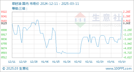 3月11日,生意社菜籽油基准价为9255.00元/吨,与本月初(8870.00元/吨)相比,上涨了4.34%。