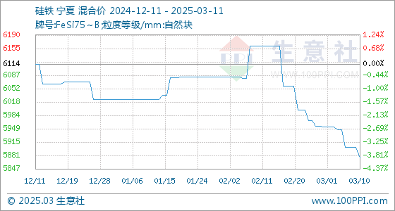 3月11日,生意社硅铁基准价为5875.71元/吨,与本月初(5954.29元/吨)相比,下降了-1.32%。