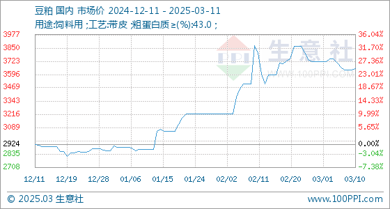 3月11日,生意社豆粕基准价为3652.00元/吨,与本月初(3722.00元/吨)相比,下降了-1.88%。