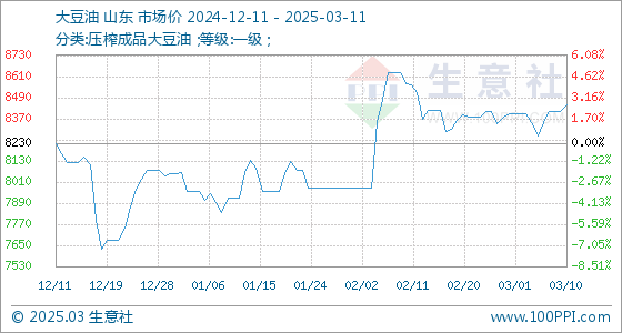 3月11日,生意社大豆油基准价为8448.00元/吨,与本月初(8400.00元/吨)相比,上涨了0.57%。