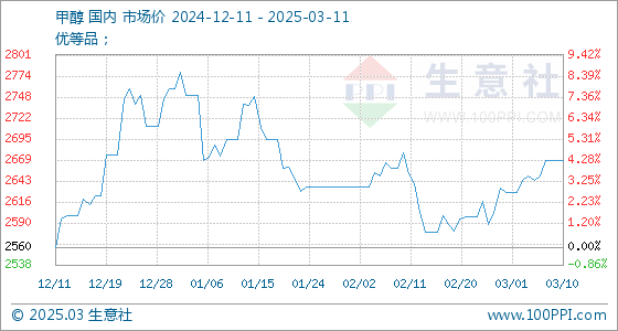3月11日,生意社甲醇基准价为2669.17元/吨,与本月初(2629.17元/吨)相比,上涨了1.52%。