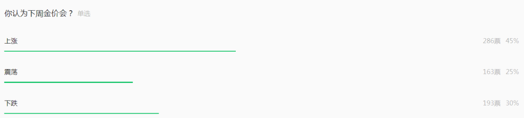 3月3日当周,伦敦黄金价格开盘2873.62美元/盎司,最高2930.46美元/盎司,最低2858.83美元/盎司,收盘2911.26美元/盎司。北京黄金经济发展研究中心调查显示,市场人士认为本周国际金价震荡可能性较大。投票显示,有45%的读者看涨本周金价、25%看震荡、30%看空。
