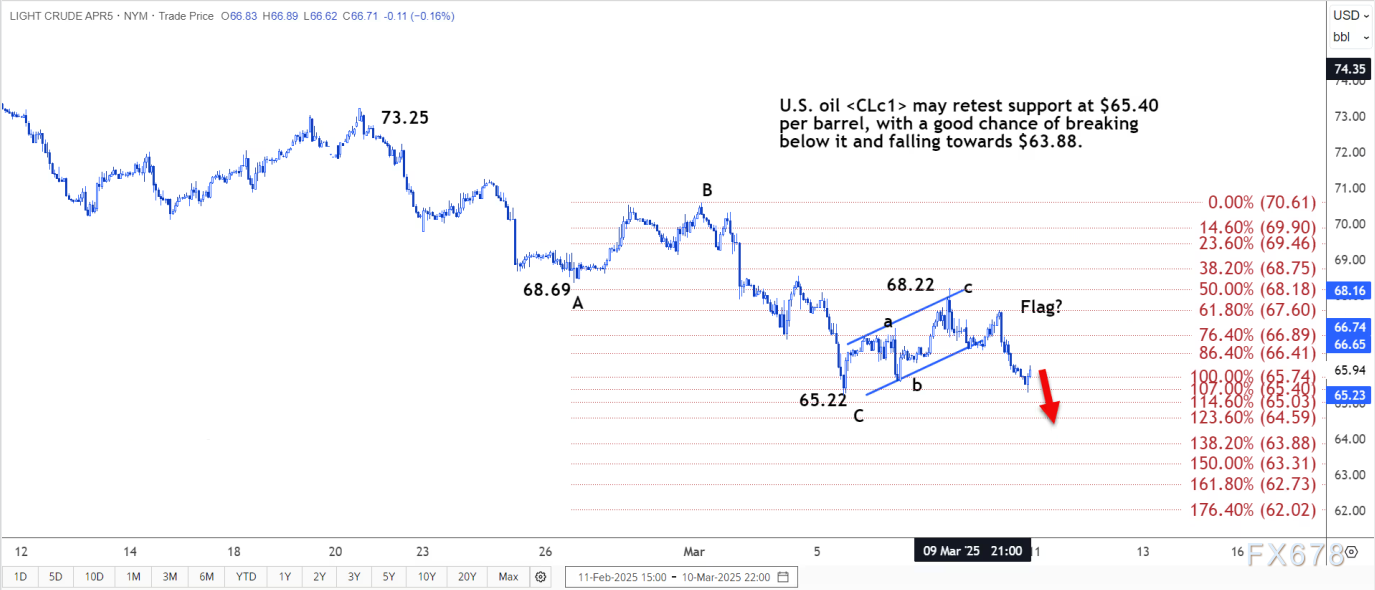 技术分析:美原油或将重新测试65.40美元的支撑位