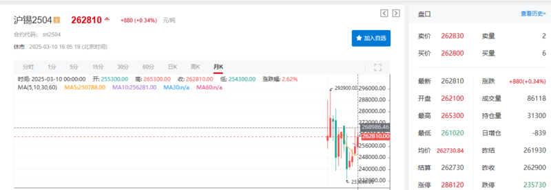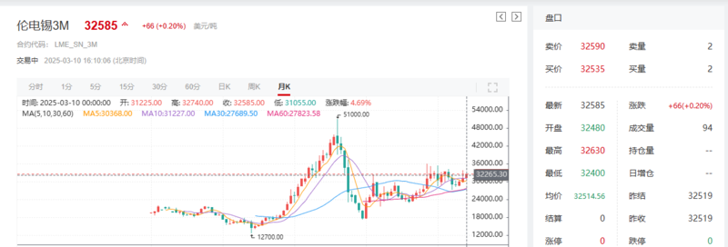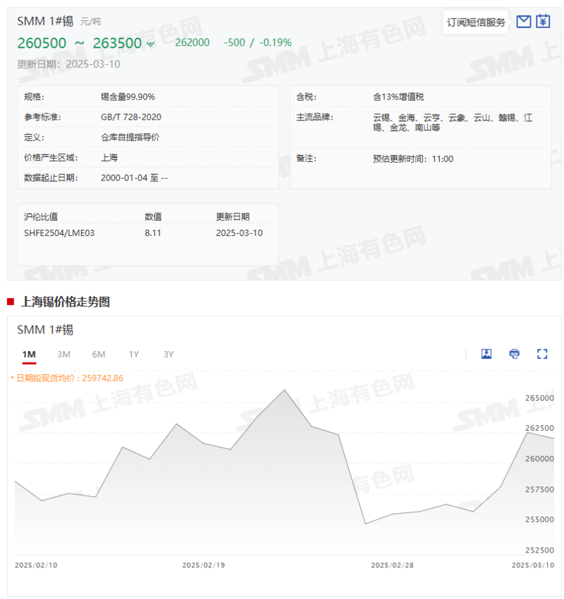 虽然2月底佤邦复产预期升温曾经击落锡价,但是国内宏观暖风频吹,且矿端尚处供应偏紧的预期以及半导体等下游需求增长可期等带动2月锡价延续前2个月的涨势继续出现上涨,其中伦锡2月涨4.01%,沪锡2月以3.19%的涨幅收官。进入三月,虽然美国关税政策反复无常及缅甸佤邦锡矿复产预期强化扰动锡价,但受两会利好支撑,下游逢低补库需求释放叠加美元指数走弱提振金属价格,锡价走势出现企稳回升,截至3月10日16:09分,伦锡涨0.2%,报32585美元/吨,其3月月线暂时涨4.07%;沪锡涨0.34%,报262810元/吨,其3月月线暂时涨2.99%。