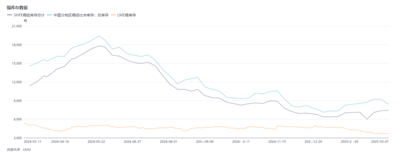 国内:据SMM调研,截止到3月7日,SMM锡锭三地社会库存总量为8399吨,较上周库存数据去库754吨。