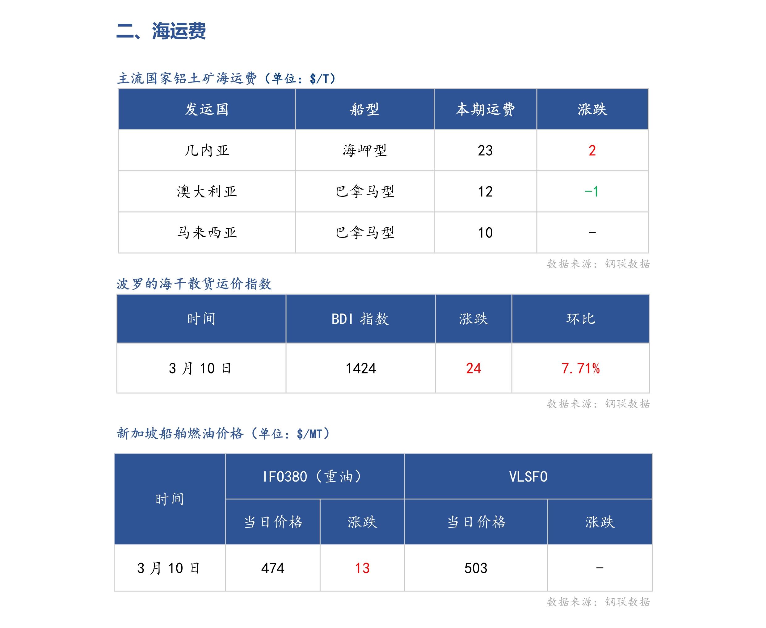 3月11日铝土矿价格平稳运行。近期氧化铝企业消耗库存为主,低价采购意愿明显。近期几内亚远期现货报盘价在95左右,但没有成交。