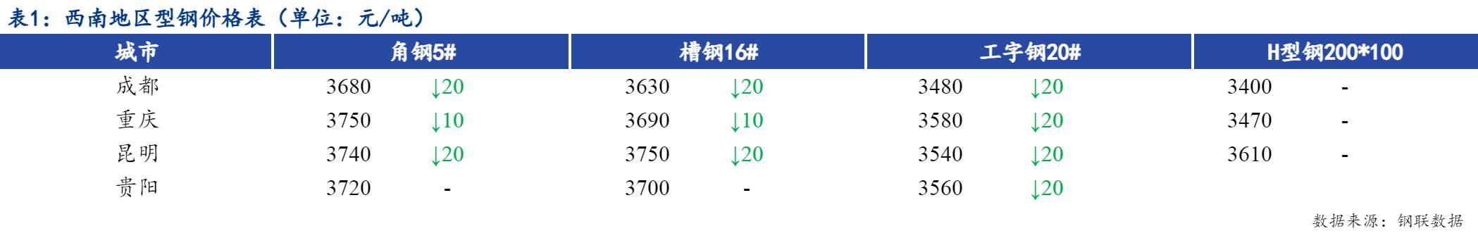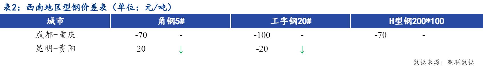 成都与重庆角钢价差扩大,工字钢价差不变,H型钢价差不变;昆明和贵阳角钢价差缩小,工字钢价差价差缩小。