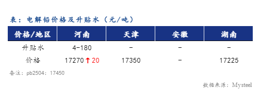 期铅区间震荡运行,河南市场贸易商对沪铅2504合约报贴水160-180元/吨出厂,贴水不变;广东市场持货商报17320-17330元/吨出厂。上海地区持货商对铅主力合约报升水50元/吨出厂。