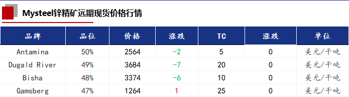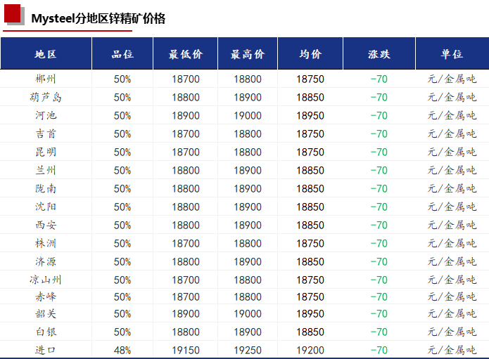 今日国内锌精矿加工费各地区暂未调整,和上一交易日持平。受锌价的影响,锌精矿价格下降70元/金属吨。进口TC市场主流报价在10-30美元/干吨,暂无波动。