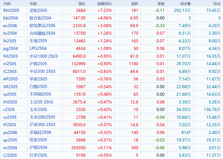 沪深300股指期货(IF)主力合约涨0.37%,上证50股指期货(IH)主力合约涨0.48%,中证500股指期货(IC)主力合约涨0.83%,中证1000股指期货(IM)主力合约涨0.94%。