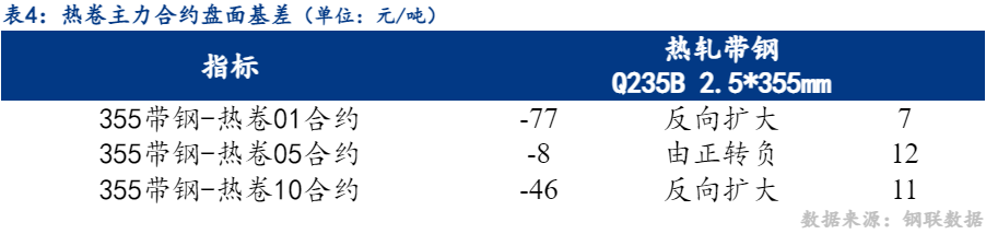 11日市场热卷05合约与355带钢价差由正转负12元/吨,热卷10合约与355带钢价差反向扩大11元/吨。