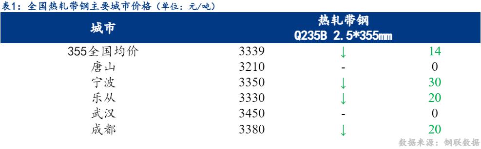 11日热轧带钢全国主要城市价格主降个稳,截至发稿时2.5*355mm热轧带钢均价3339元/吨,较昨下跌14元/吨,其中2.5*355mm主要城市报价为唐山3210元/吨,宁波3350元/吨,乐从3330元/吨。