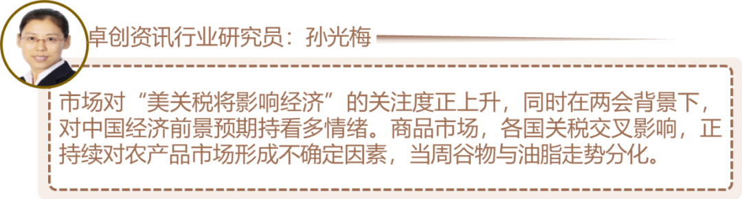 卓创资讯研究员孙光梅:市场对“美关税将影响经济”的关注度正上升,同时在两会背景下,对中国经济前景预期持看多情绪。商品市场,各国关税交叉影响,正持续对农产品市场形成不确定因素,当周谷物与油脂走势分化。