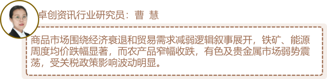 卓创资讯研究员曹慧:商品市场围绕经济衰退和贸易需求减弱逻辑叙事展开,铁矿、能源周度均价跌幅显著,而农产品窄幅收跌,有色及贵金属市场弱势震荡,受关税政策影响波动明显。