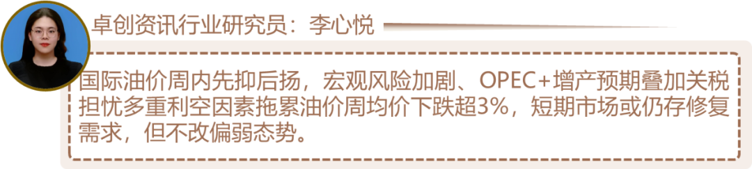 卓创资讯研究员李心悦:国际油价周内先抑后扬,宏观风险加剧、OPEC+增产预期叠加关税担忧多重利空因素拖累油价周均价下跌超3%,短期市场或仍存修复需求,但不改偏弱态势。