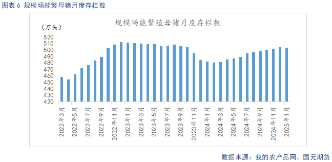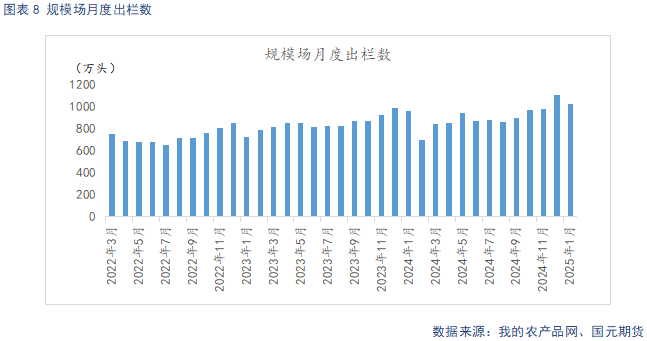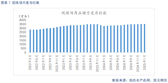 据Mysteel统计,截止2025年1月底,规模场能繁母猪存栏量为504.19万头,环比下调0.04%,同比增长4.54%。1月气温骤降,北方雨雪天气频发,疫病防控难度增大,规模场优化产能,高龄母猪淘汰加速,能繁母猪存栏环比小幅下降。自24年3月起,养殖利润回暖支撑下,规模场产能逐步回升,从生产周期推算,2025年规模场理论产能呈现环比上升态势。规模场12月商品猪存栏数为3517.11万头,环比减少0.25%,同比增加7.43%。规模场12月商品猪出栏量为1129.61万头,环比下降6.82%,同比增加7.01%。随着猪价回暖,标肥价差收窄,二育情绪降温,养殖端逢高出栏意愿较强,出栏逐步开始增量。近期大范围雨雪天气,导致供给短期收紧,不过2月压栏、二育较多,供给后置释放压力较大。