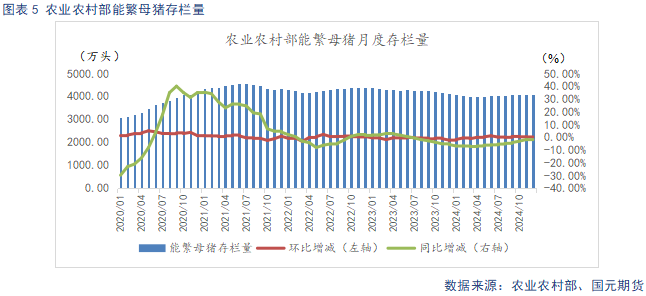 根据农业农村部数据显示,2024年12月末全国能繁母猪存栏量4078万头,同比下降1.9%,环比下调0.04%。根据农业农村部新修正的《生猪产能调控实施方案》,当前能繁存栏相当于正常保有量的104.6%,处于绿色偏高区域。从4月份开始,能繁累计增长2.34%,2025年产能预计环比持续回升。